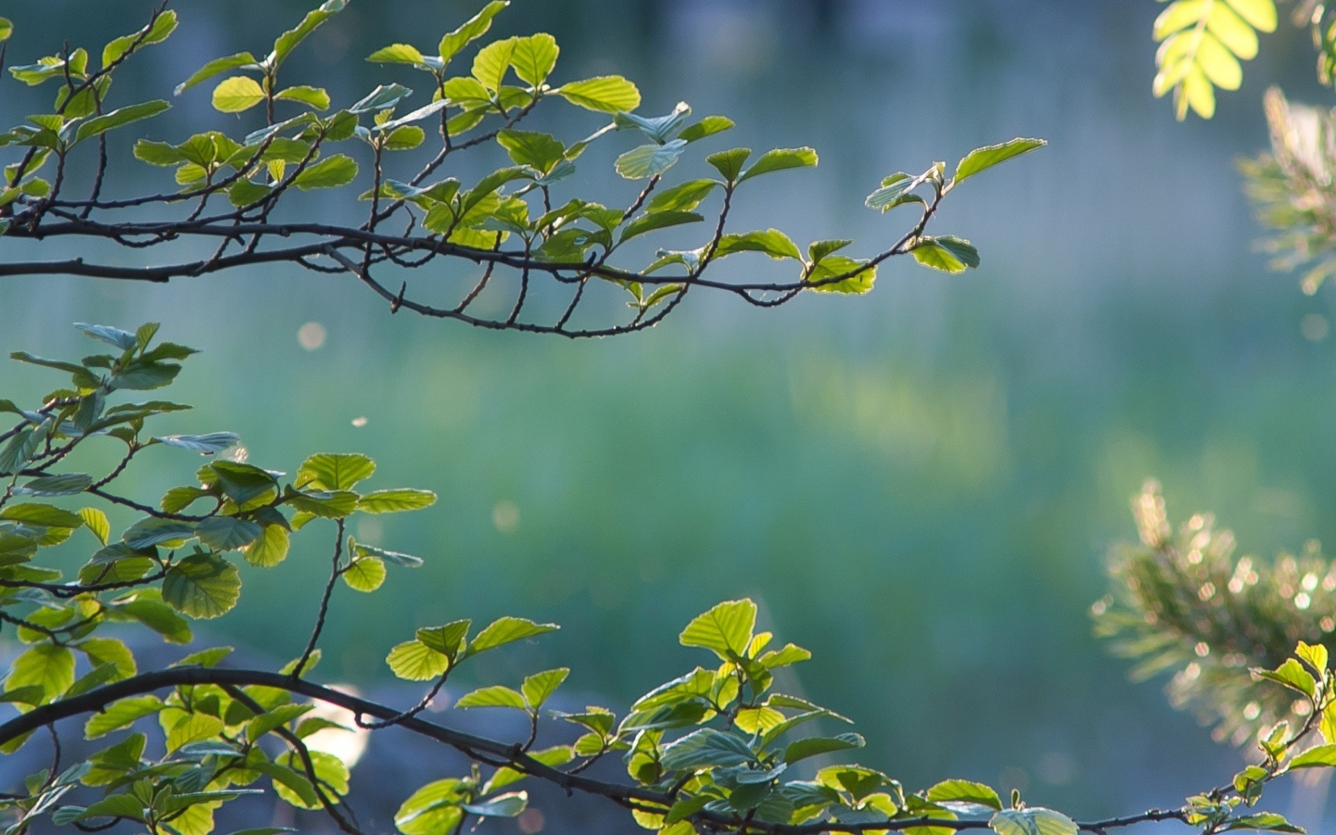 Zweige mit grünen Blättern auf blauem Waldhintergrund