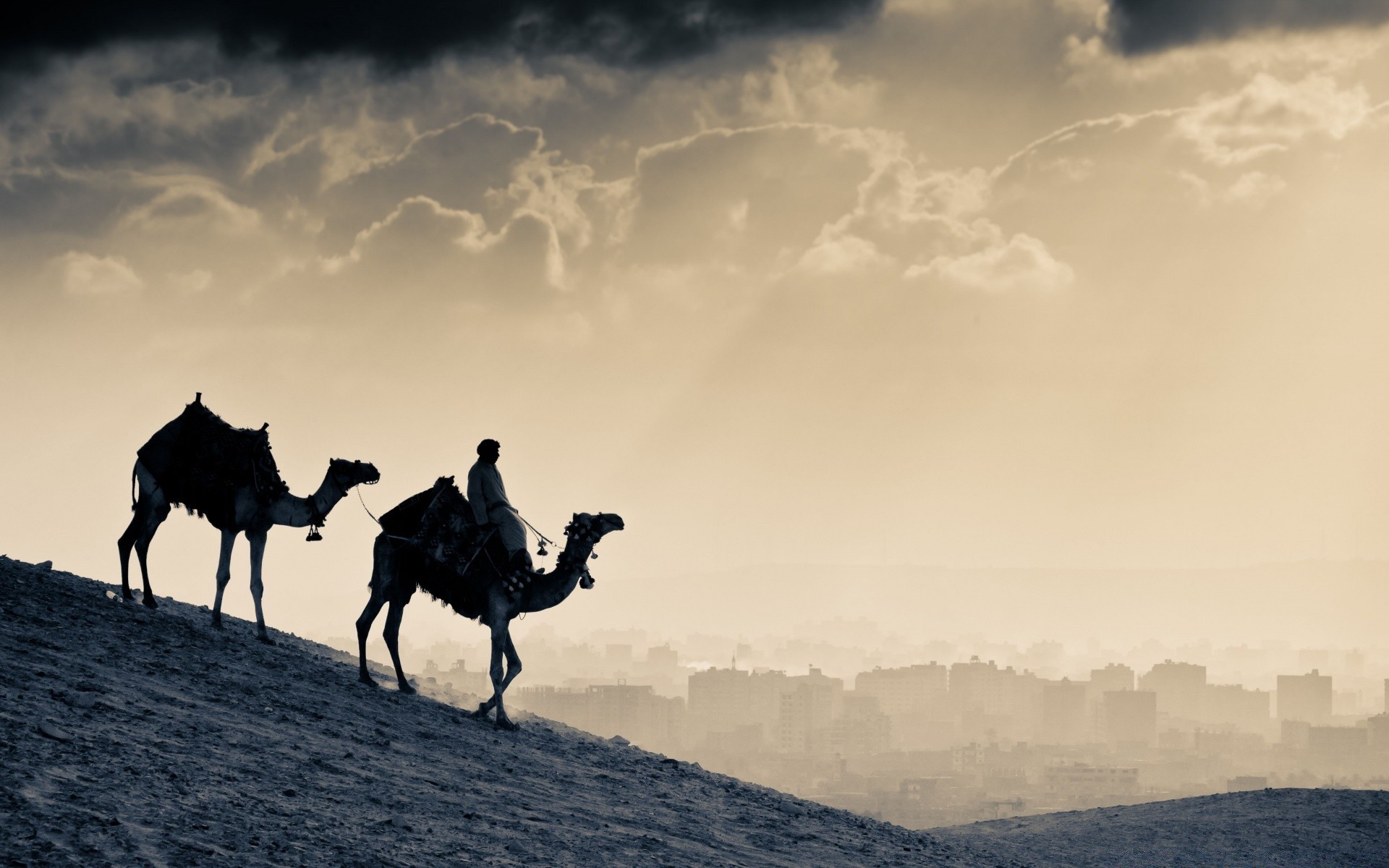 Silhouette eines verlassenen Nomaden, der auf einem Kamel auf einem Stadthintergrund reitet