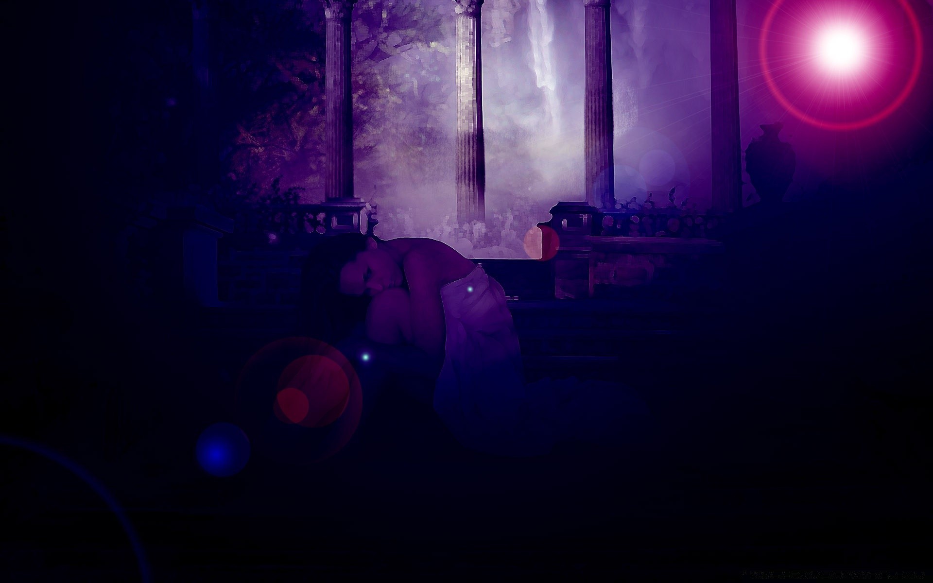 Das mädchen ist allein auf dem hintergrund der säulen traurig