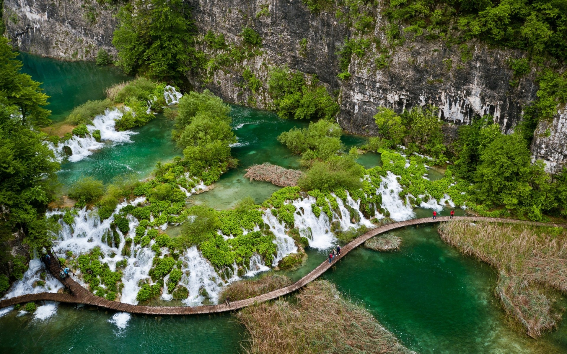 Gras wächst auf Steinen inmitten eines schnellen Flusses