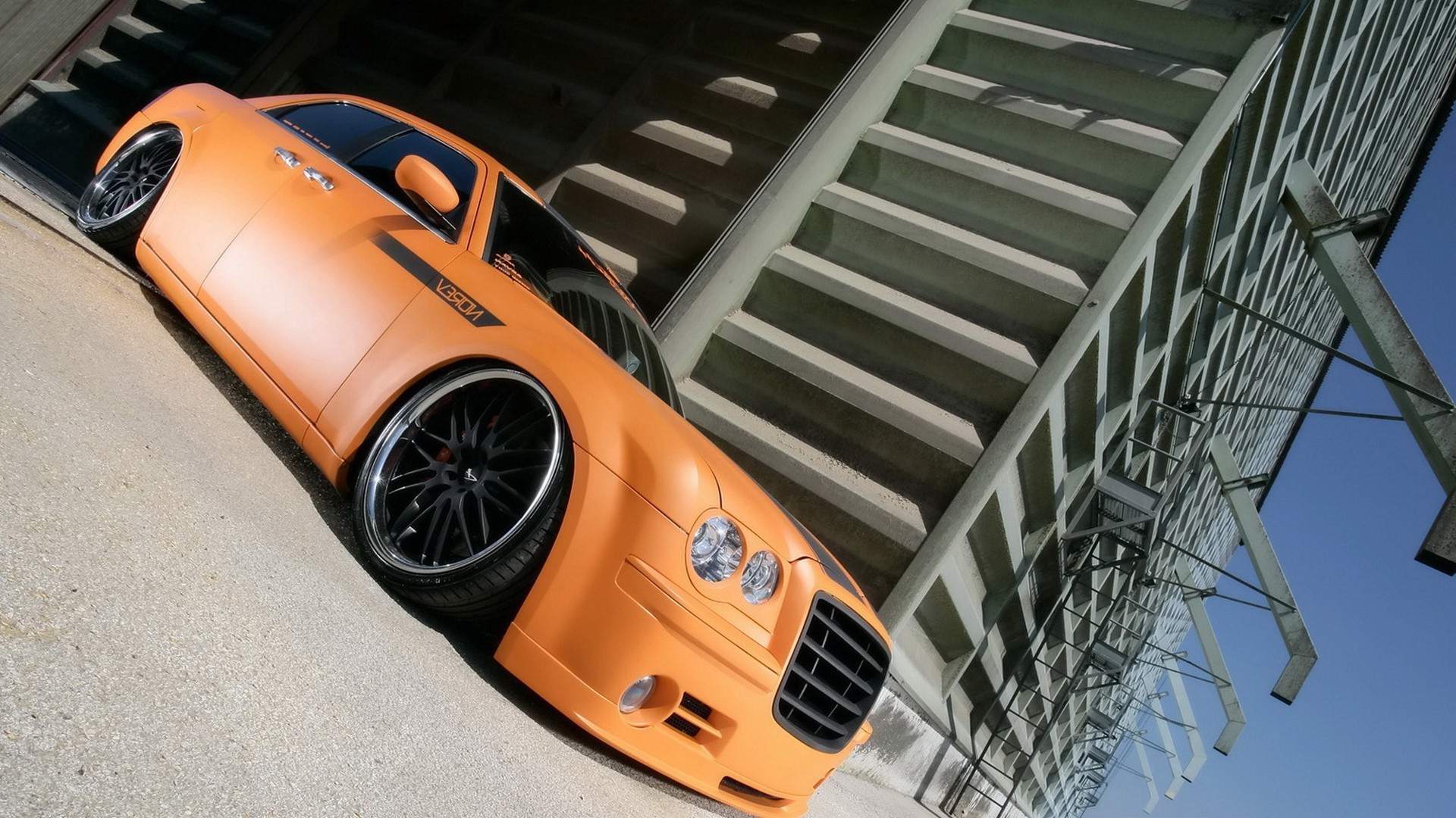 Orange Premium-Auto vor dem Hintergrund eines Betongebäudes
