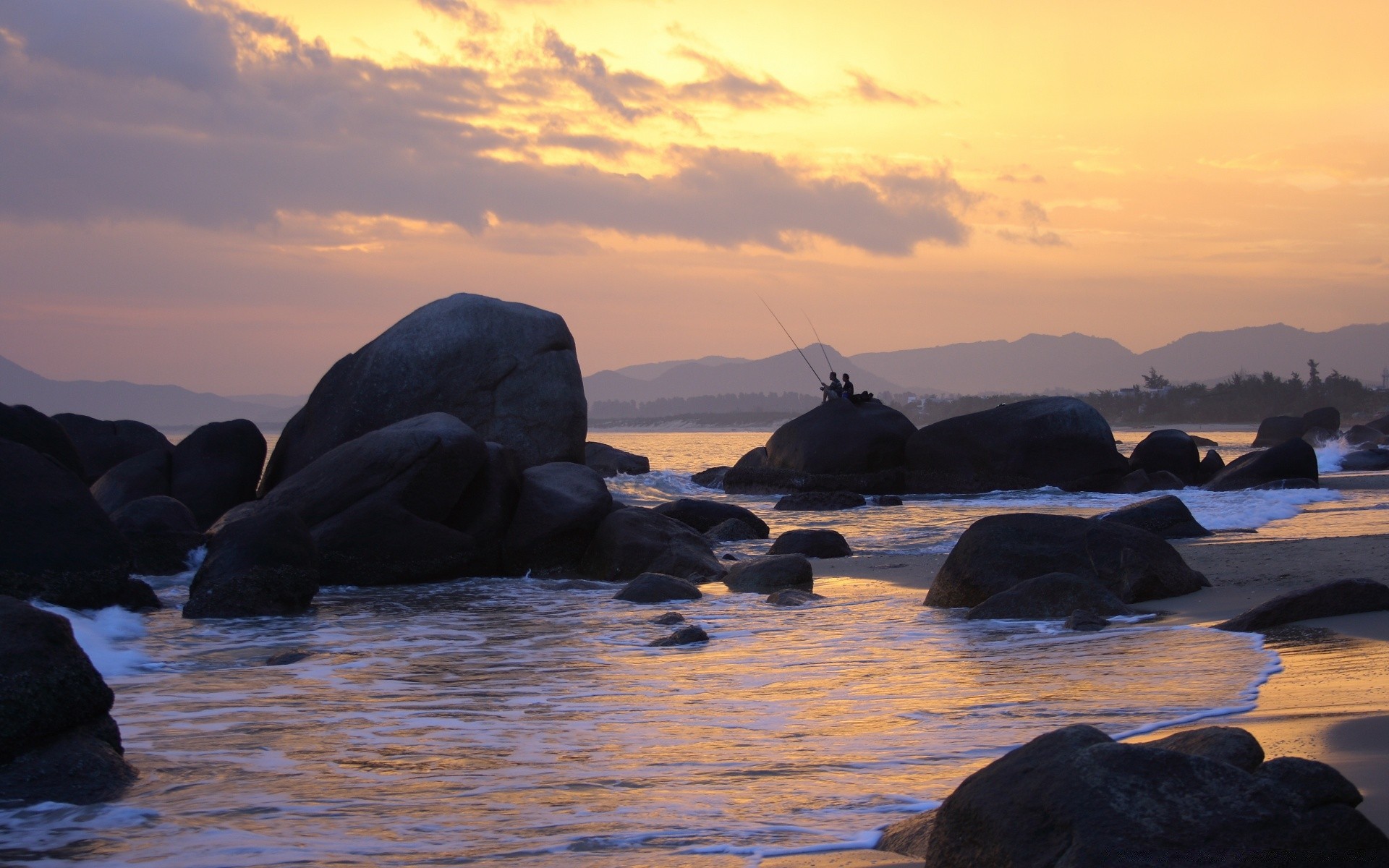 Sonnenuntergang am meer mit steinen, die aus dem wasser geschärft werdenSonnenuntergang am Meer mit Steinen, die aus dem Wasser geschärft werden