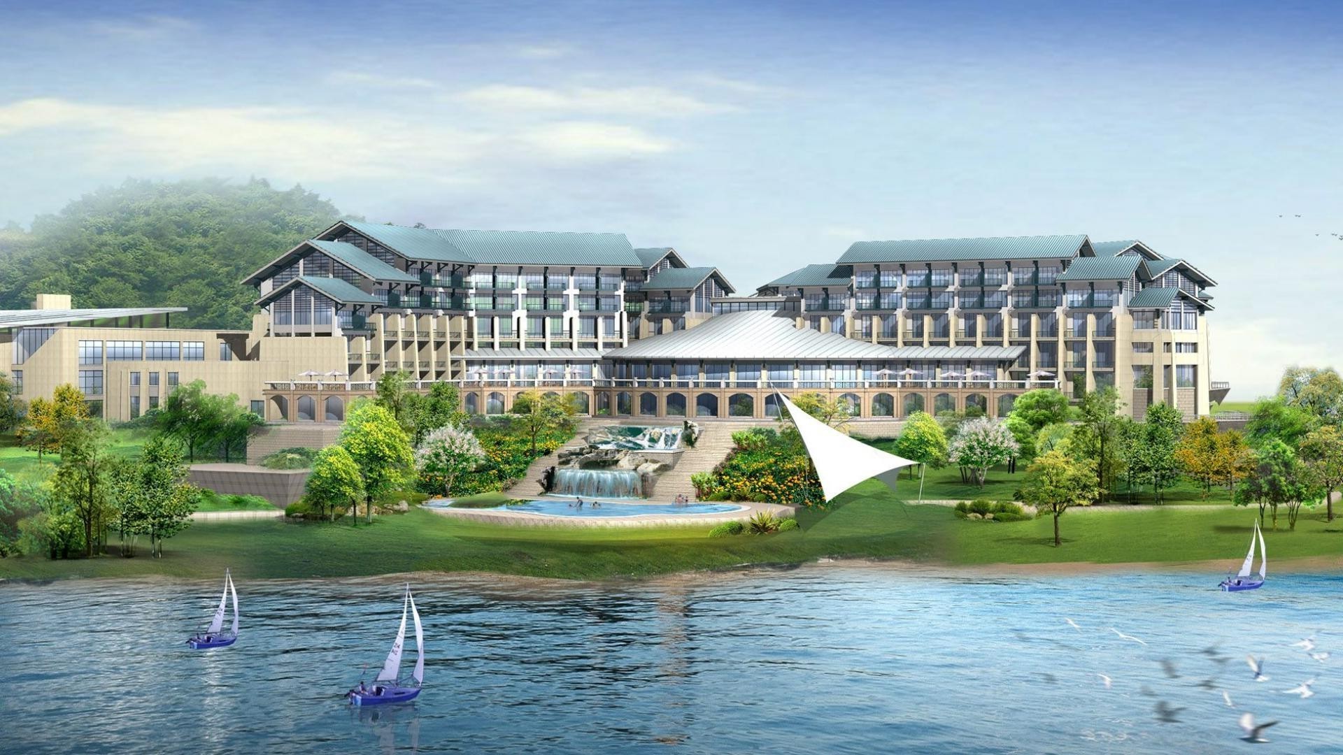 Wintergarten mit Fluss am Abend