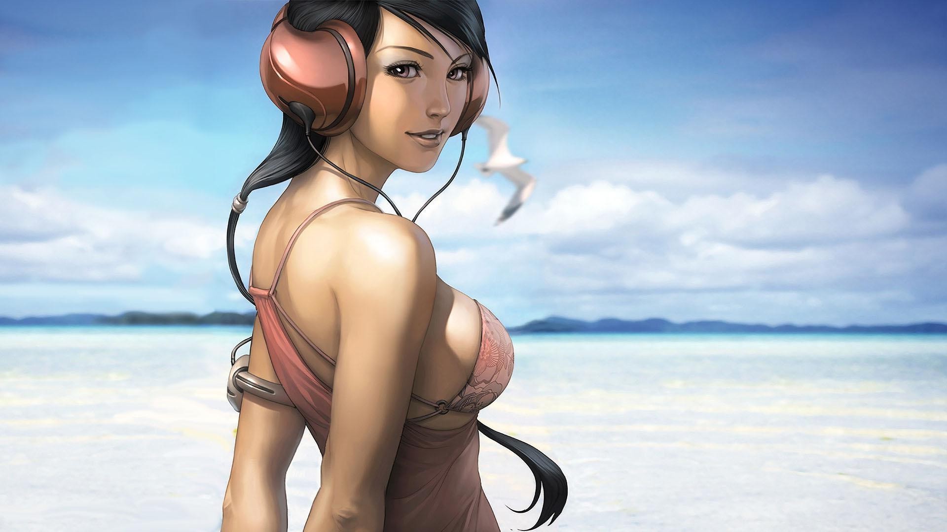 Mädchen hört musik am meer