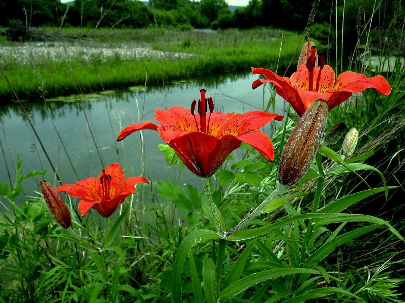 Herbstwald mit rot-gelben Kronen am Flussufer