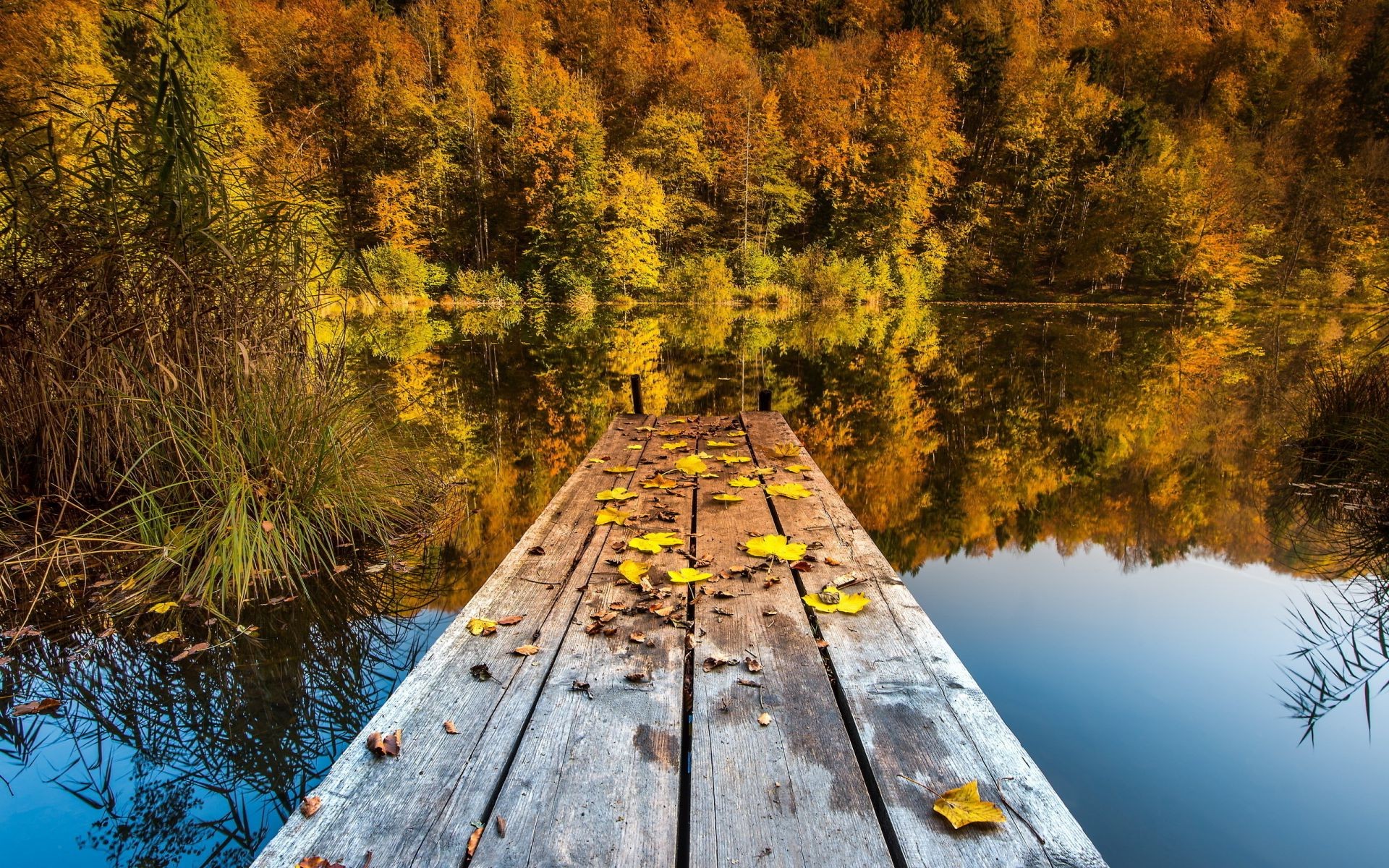 Herbstbäume am See mit Brücke