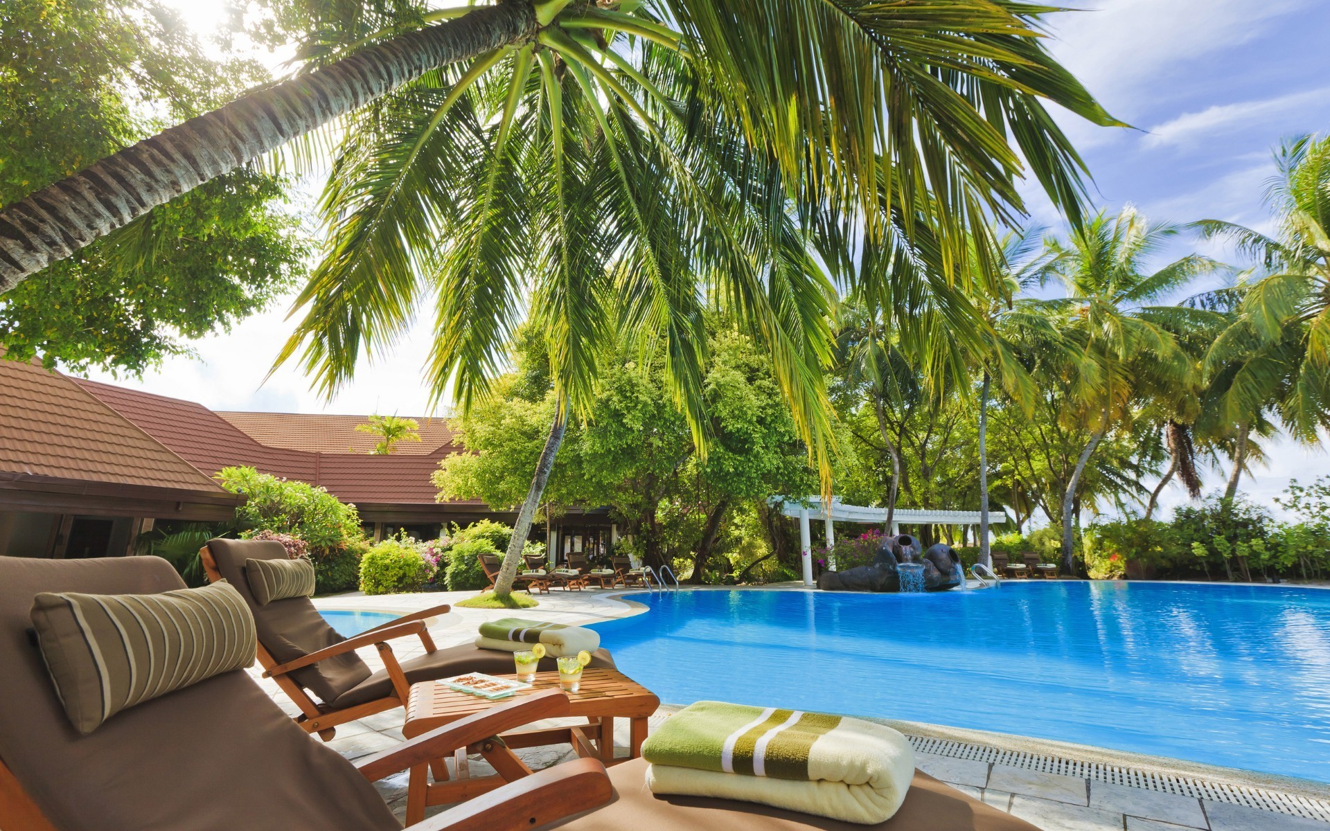 Liegestühle unter Palmen am Pool mit blauem Wasser