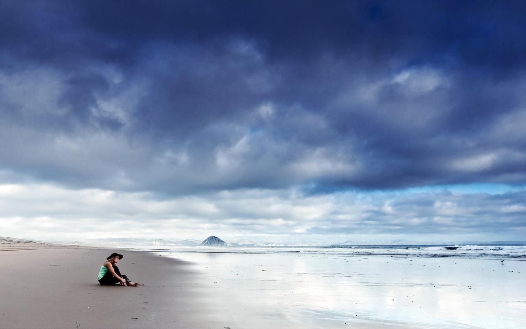 Mädchen sitzt am Meer am Himmel dunkle Wolken