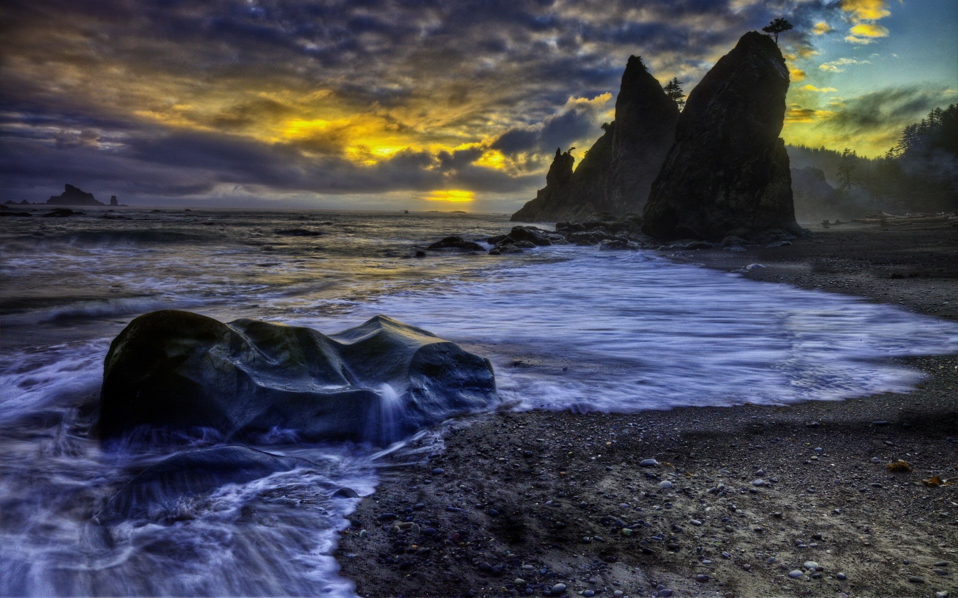 Die kalte morgendämmerung beleuchtet die riesigen steine am uferDie kalte Morgendämmerung beleuchtet die riesigen Steine am Ufer