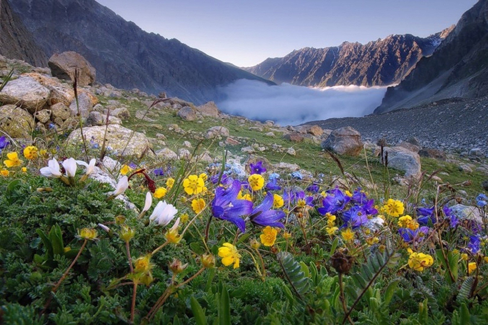 Gelbe lila Blüten neben den Steinen am Fuße des Berges auf dem Hintergrund einer nicht nebligen Wolke