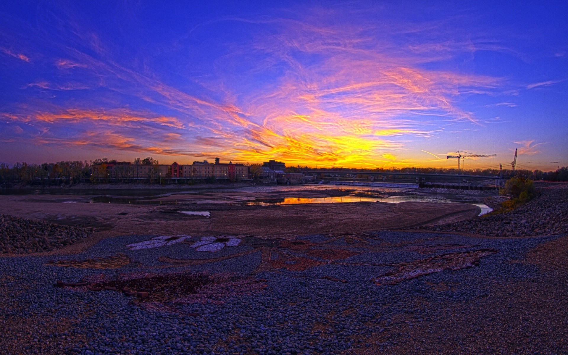 Morgendämmerung über dem moosigen Ufer des Meeres