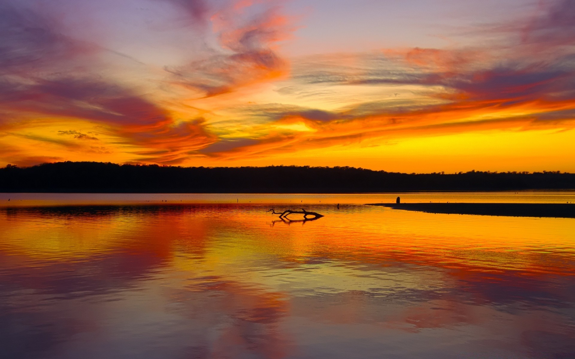 Einsamer baumstamm, der sich über dem seewasser im hintergrund des sonnenuntergangs erhebtEinsamer Baumstamm, der sich über dem Seewasser im Hintergrund des Sonnenuntergangs erhebt