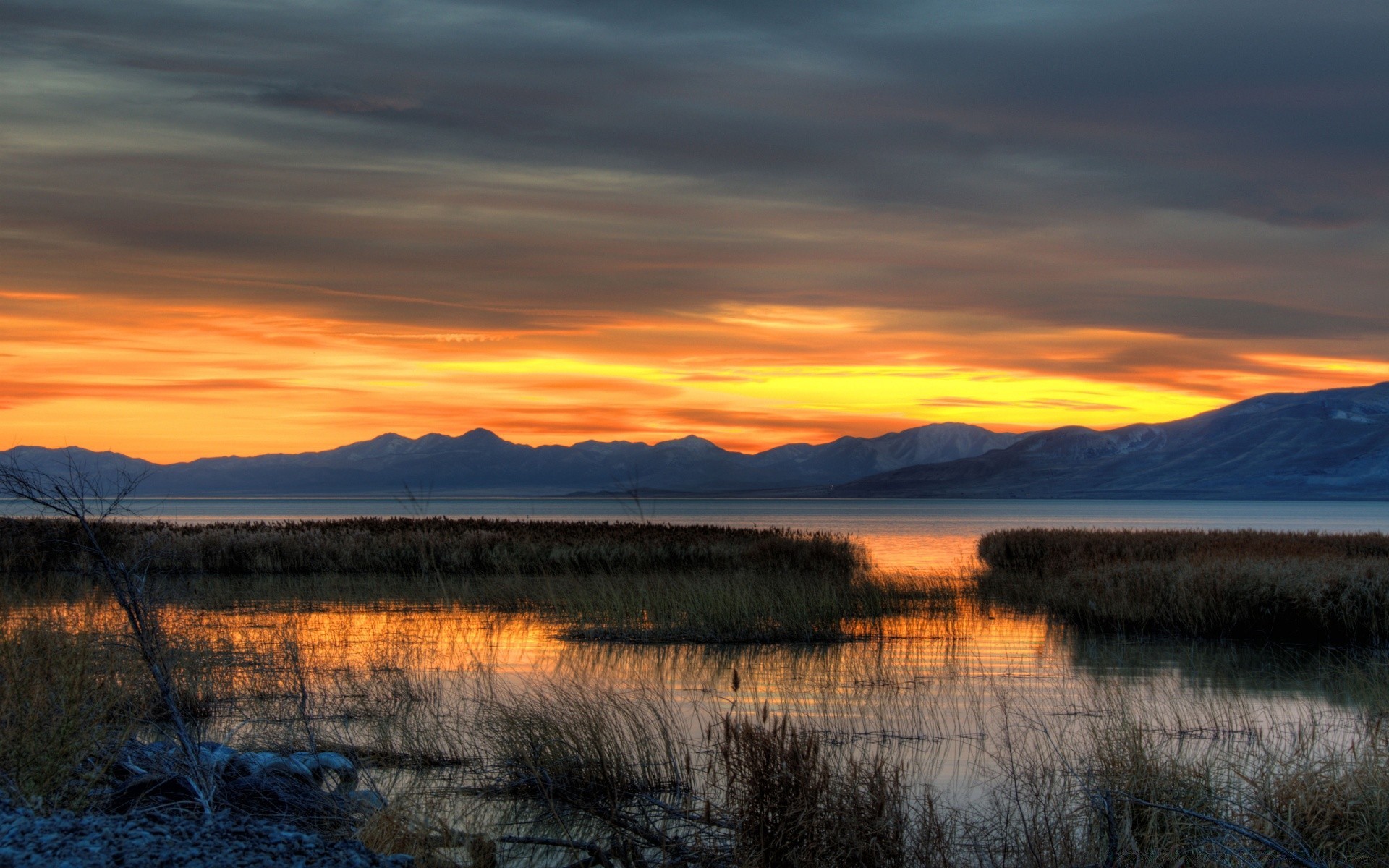 Schöner Sonnenuntergang an einem nebligen See in Amerika