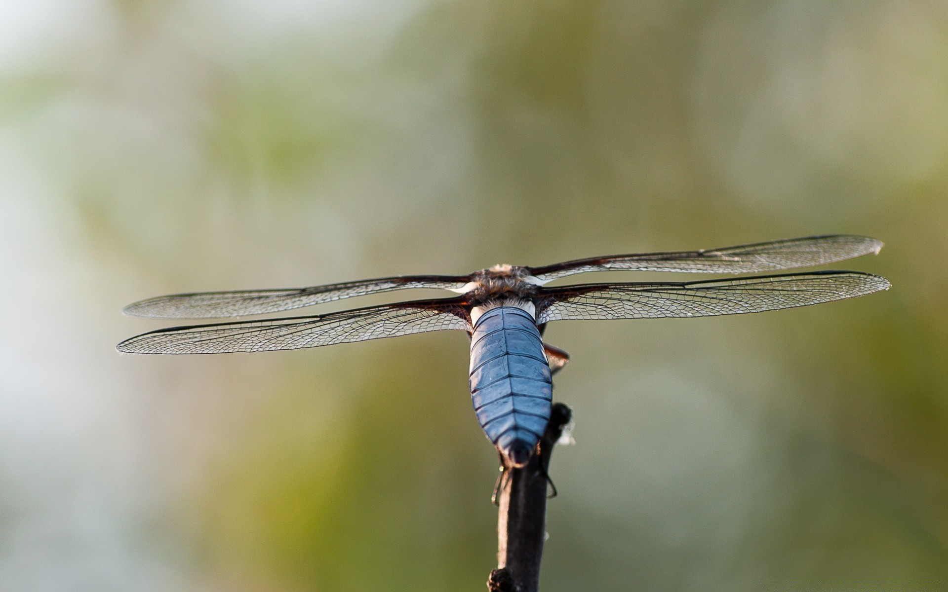 Eine blaue Libelle setzte sich an den Rand eines Zweiges