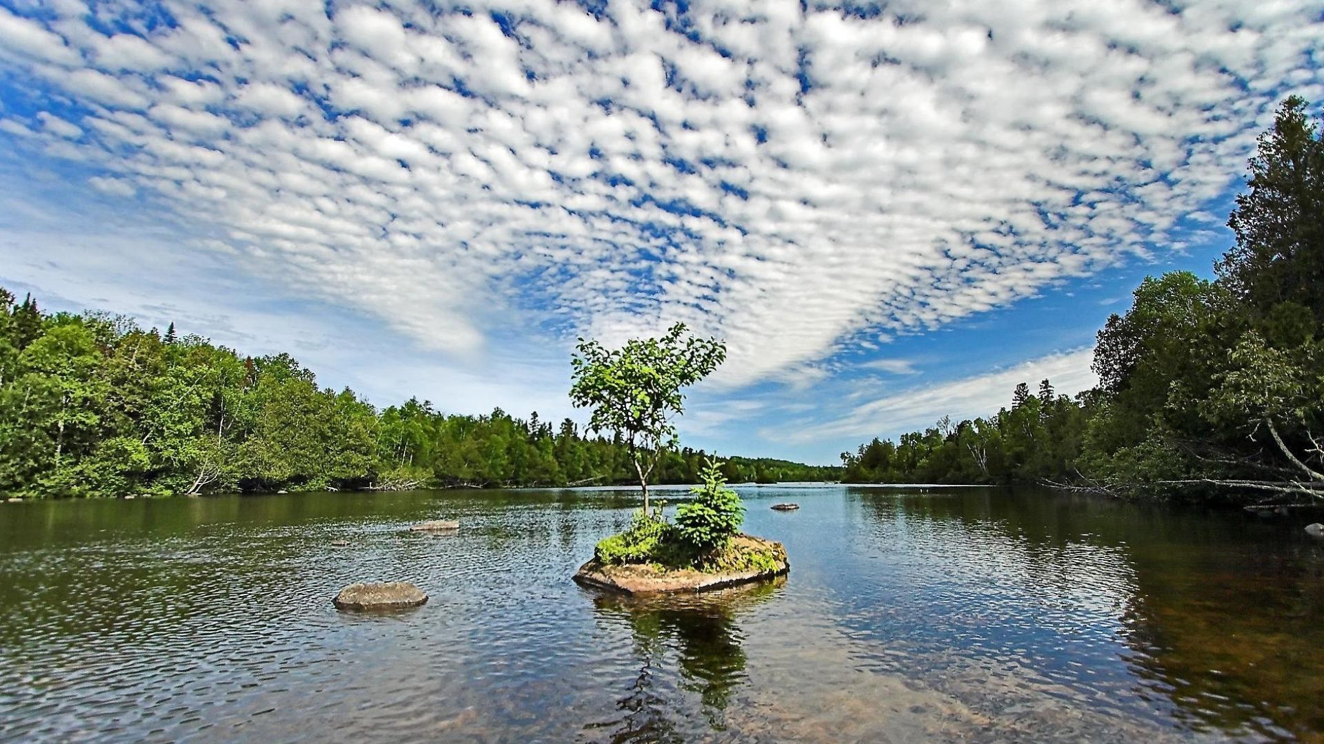 Ein Fluss mit bewölktem Himmel und Wald an den Ufern