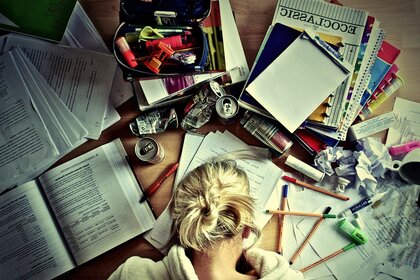 Ein mädchen mit einem pferdeschwanz sitzt hinter papierenEin Mädchen mit einem Pferdeschwanz sitzt hinter Papieren