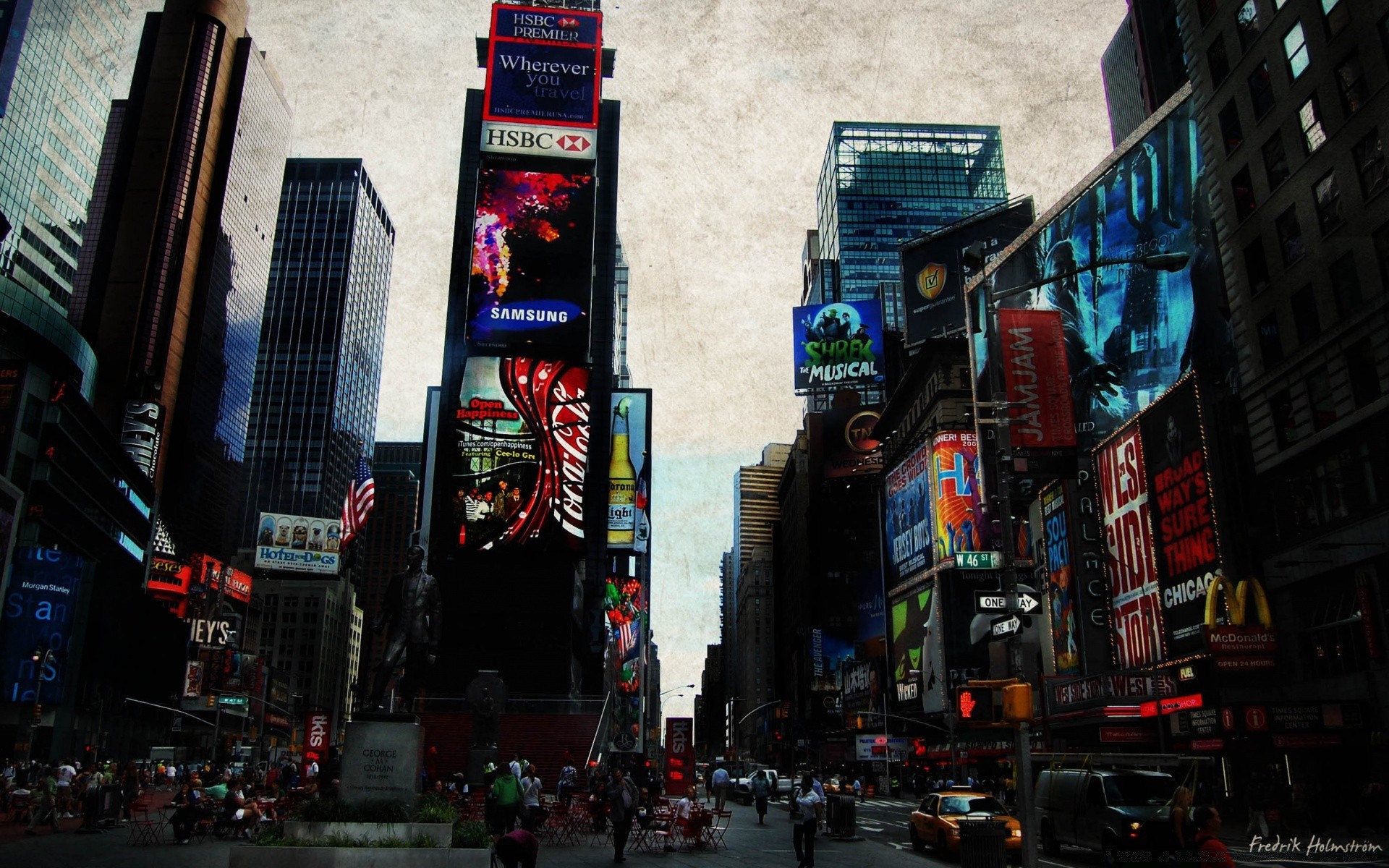 Blick auf Wolkenkratzer mit riesigen Werbemonitoren