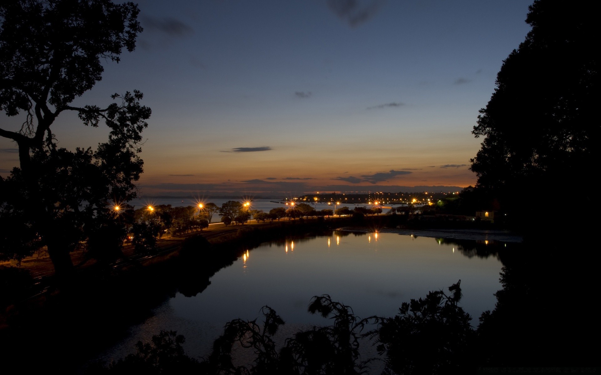 Sonnenuntergang vor dem Hintergrund einer beleuchteten Brücke