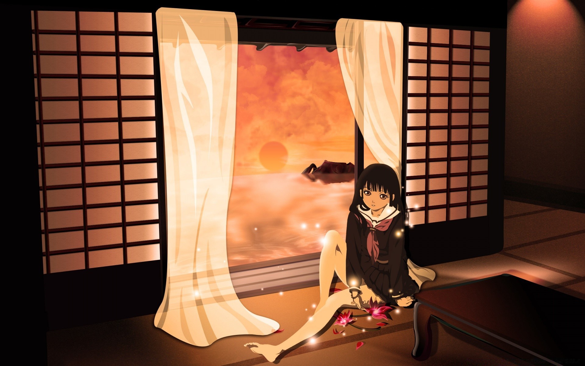 Anime Mädchen auf der couch in der Nähe von Vorhängen