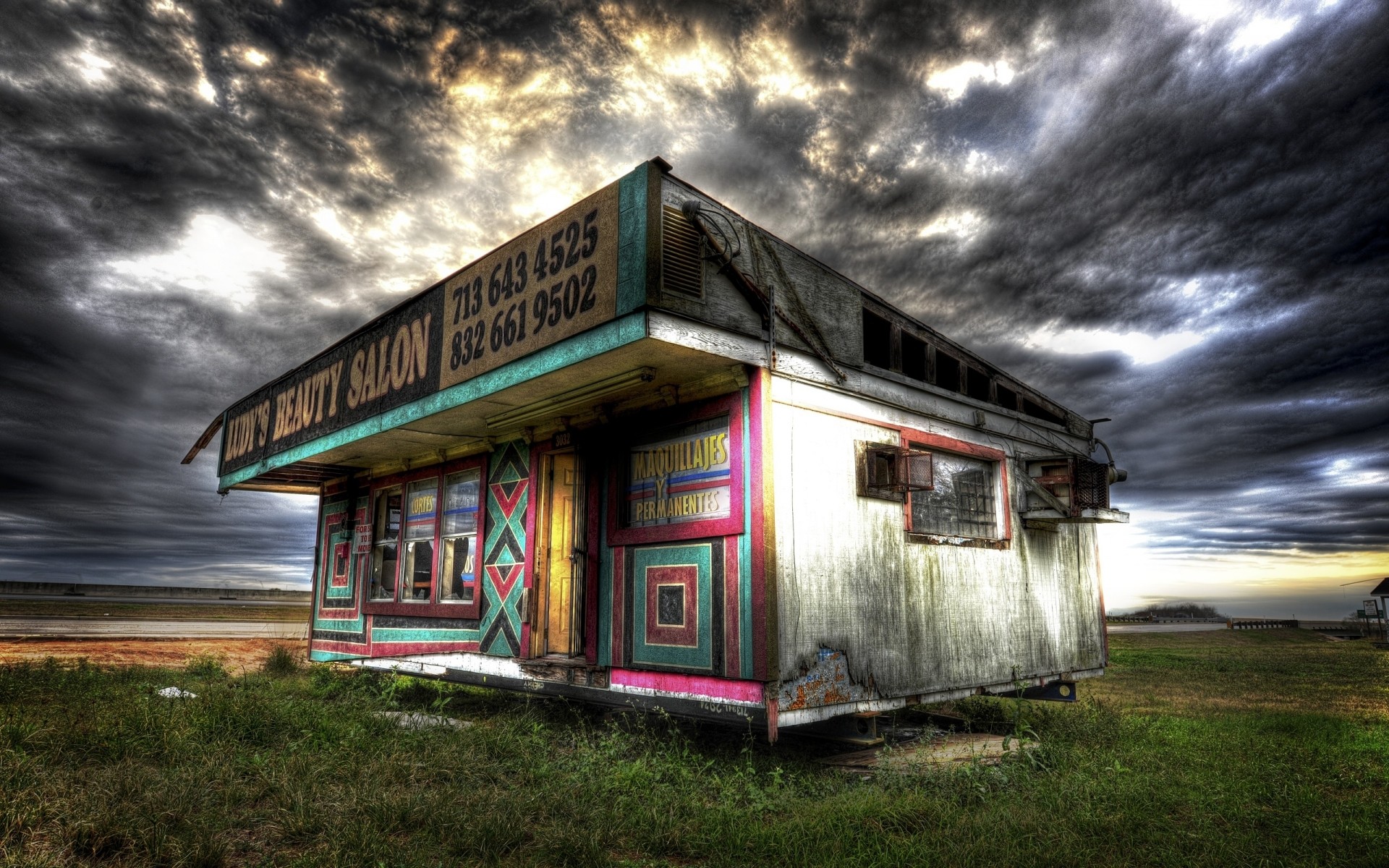 Mehrfarbiger stall vor dem hintergrund eines düsteren himmelsMehrfarbiger Stall vor dem Hintergrund eines düsteren Himmels