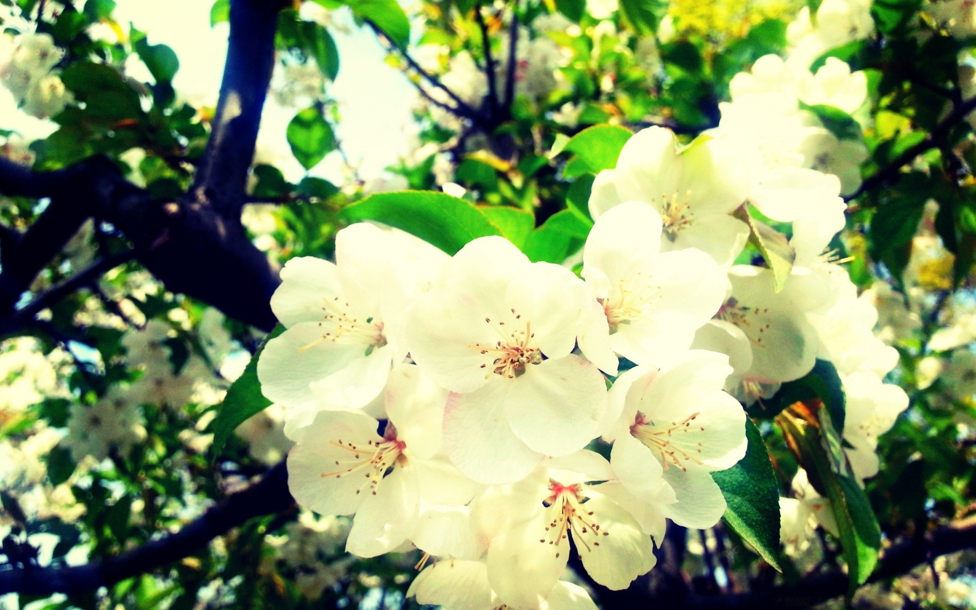 Weiße Kirschblüten und Knospen auf einem dunklen Zweig