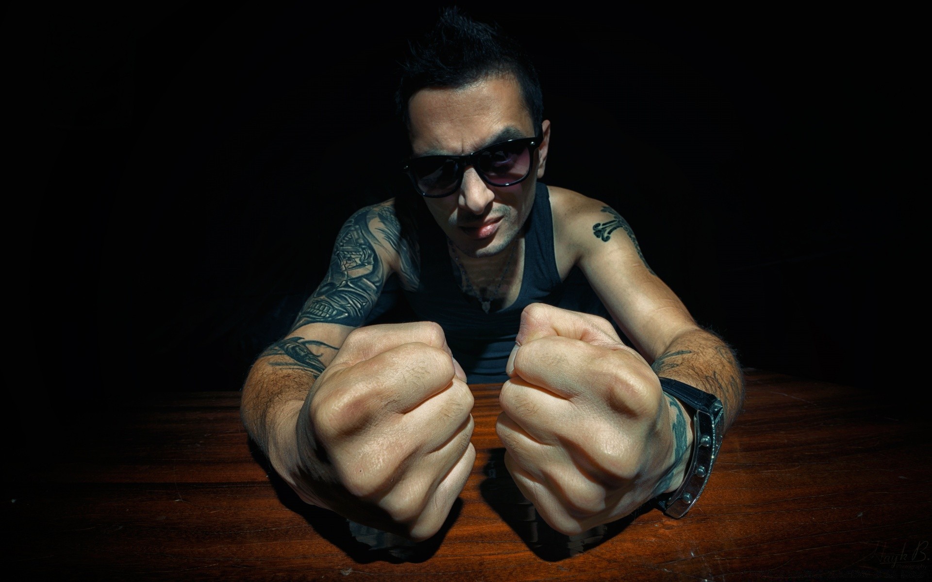 Eine mit Tätowierungen versehene Schneiderin ballt ihre Fäuste