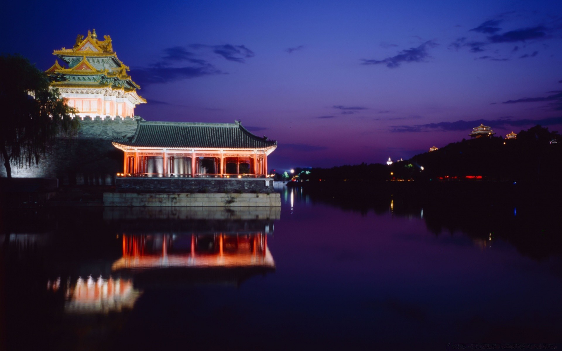 Pagode am Flussufer bei Nacht