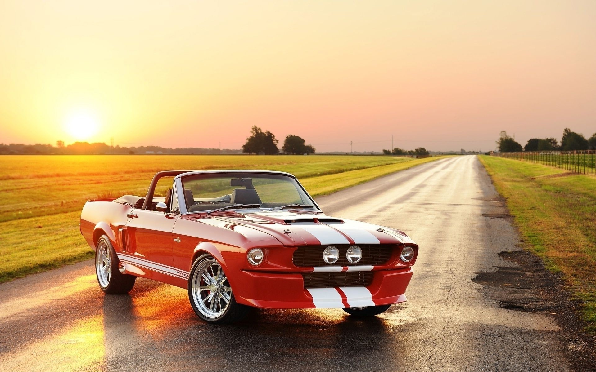 Sportwagen auf Asphalt bei Sonnenuntergang