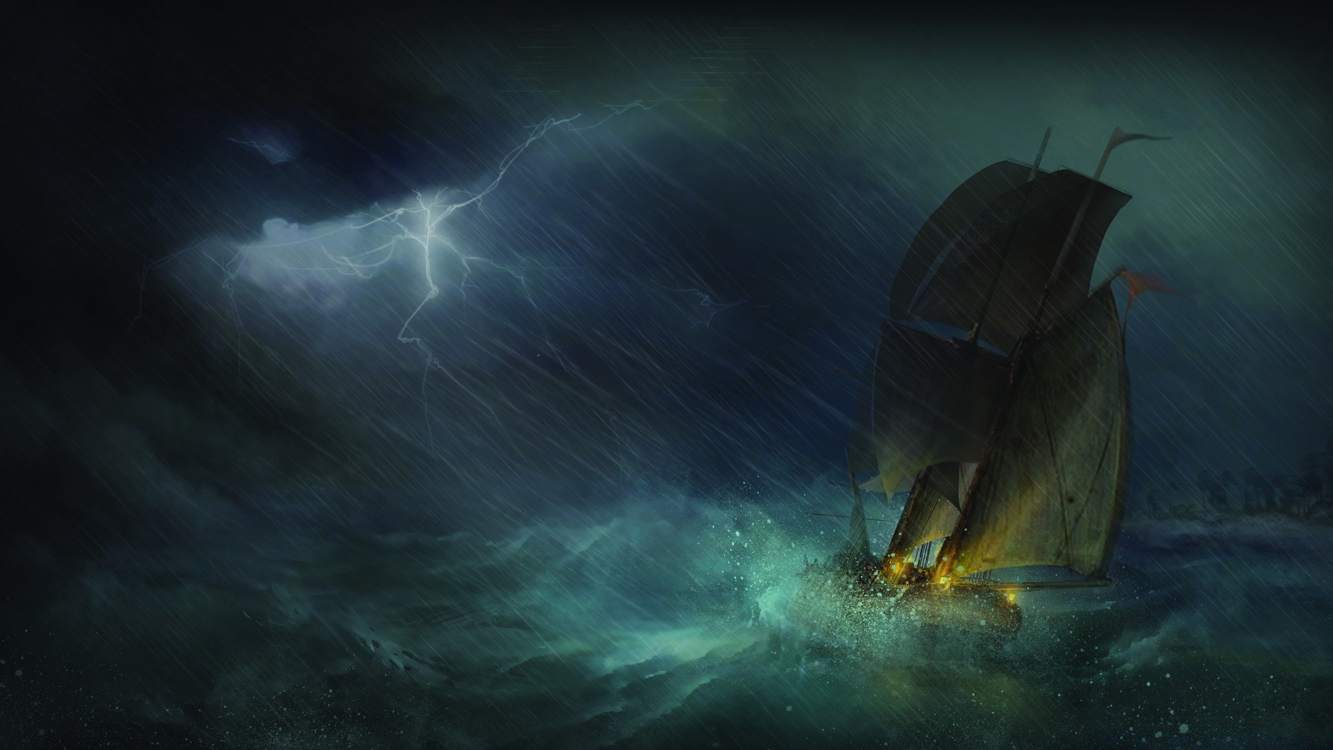 Nachts schwimmt ein schiff unter einem gewitter über das meerNachts schwimmt ein Schiff unter einem Gewitter über das Meer