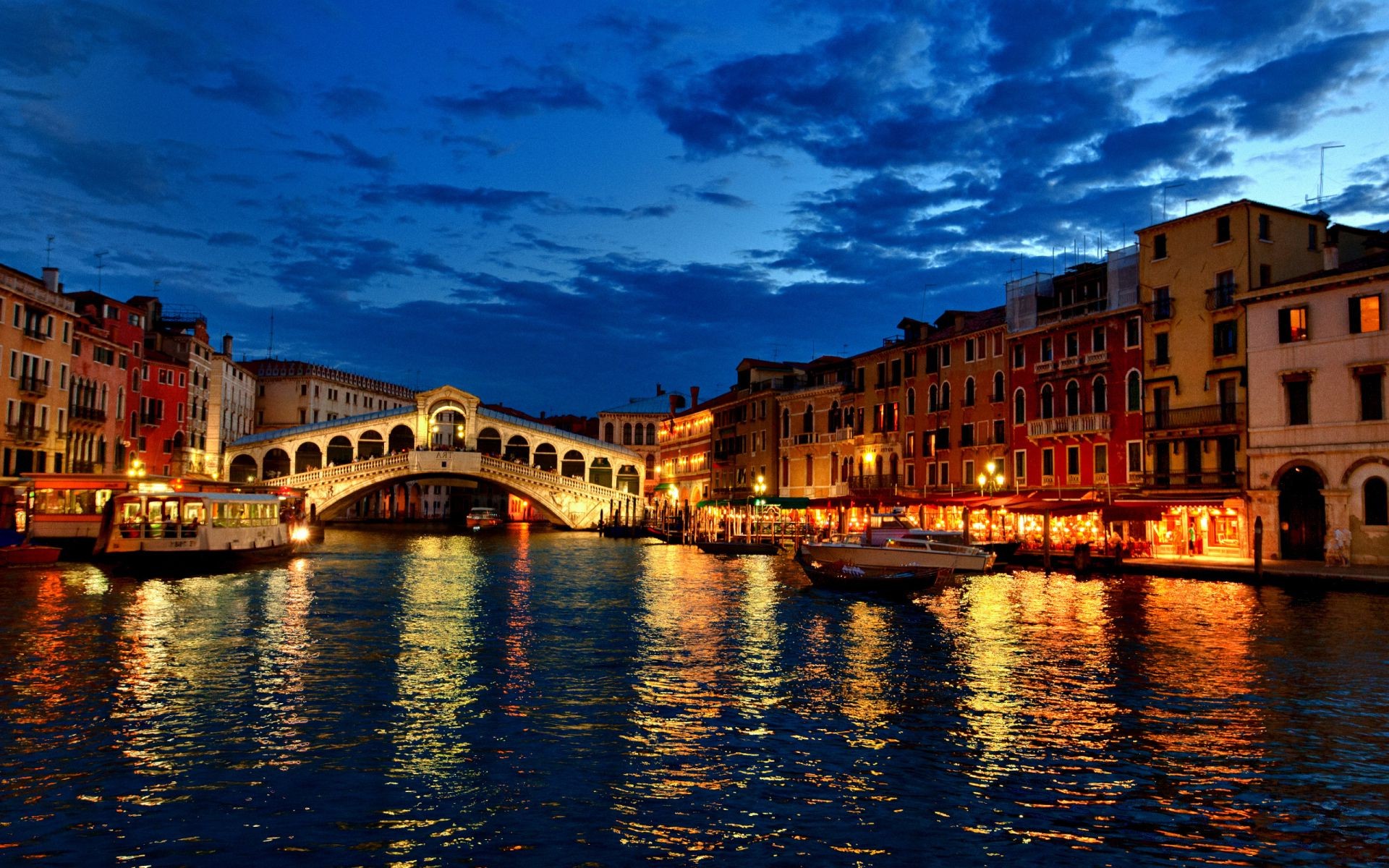 Gemütliche Stadt am Fluss am Abend
