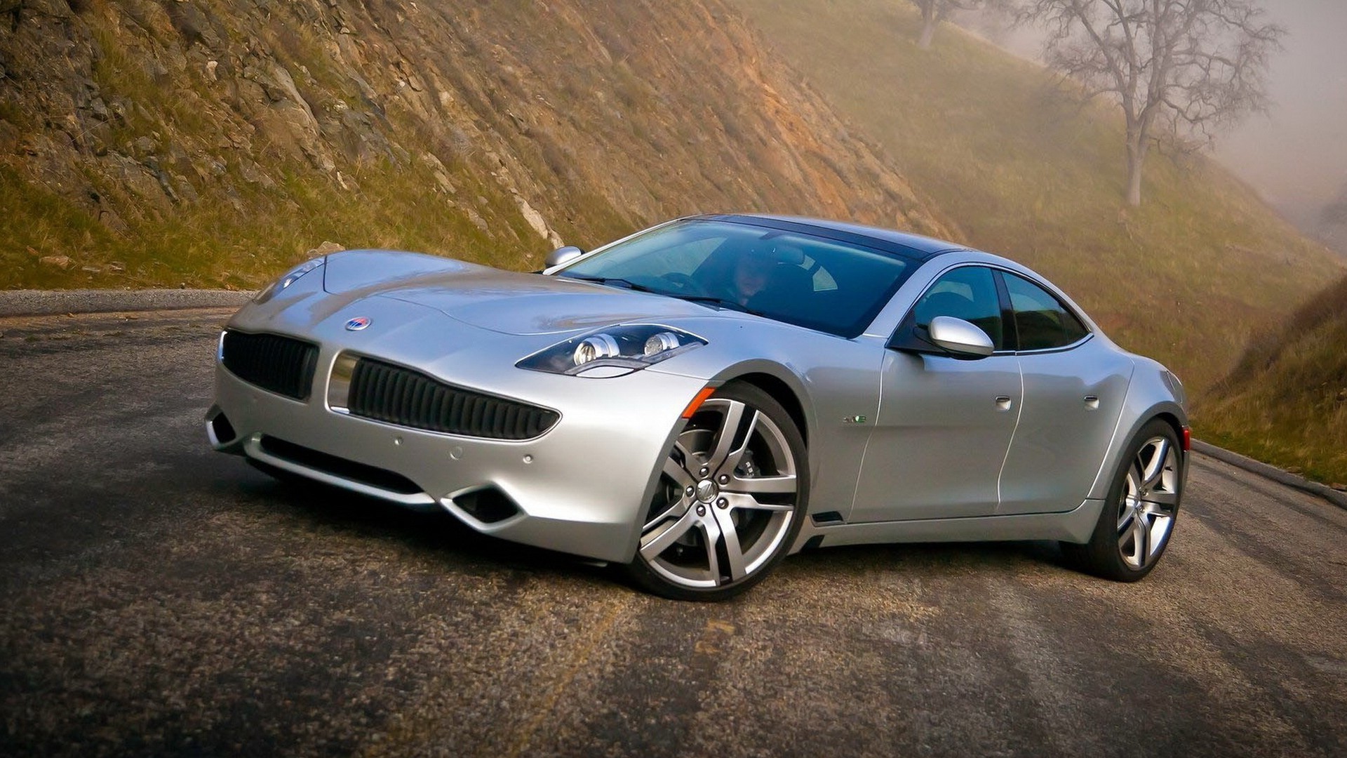 Ein silberner Sportwagen steht inmitten grüner Hügel auf der Straße