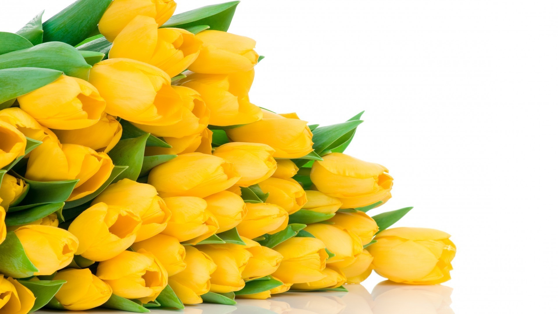 Ein großer Strauß gelber Tulpen liegt auf der Oberfläche auf weißem Hintergrund