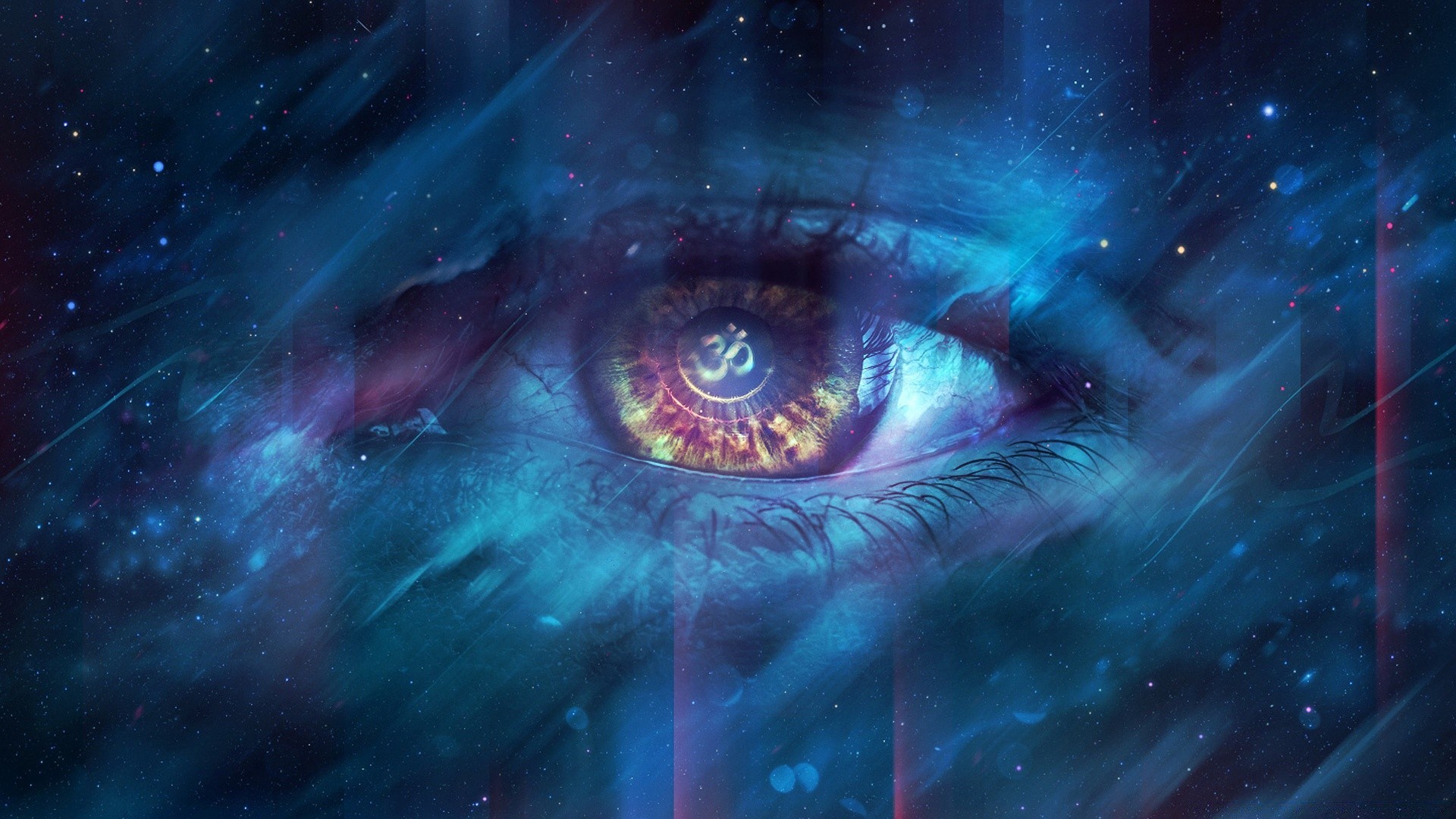 Stilisiertes Auge umgeben von Inschriften auf dunklem Hintergrund
