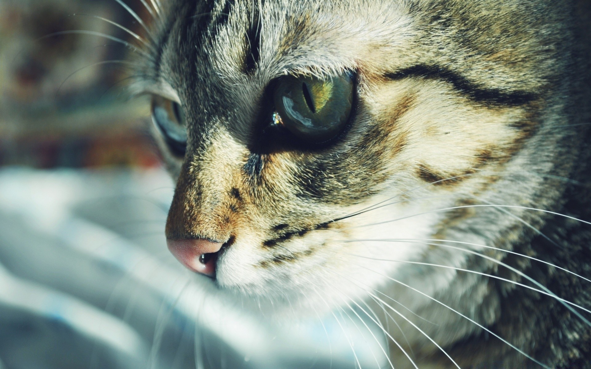 Eine grünäugige Katze, die nachdenklich auf einer Decke liegt