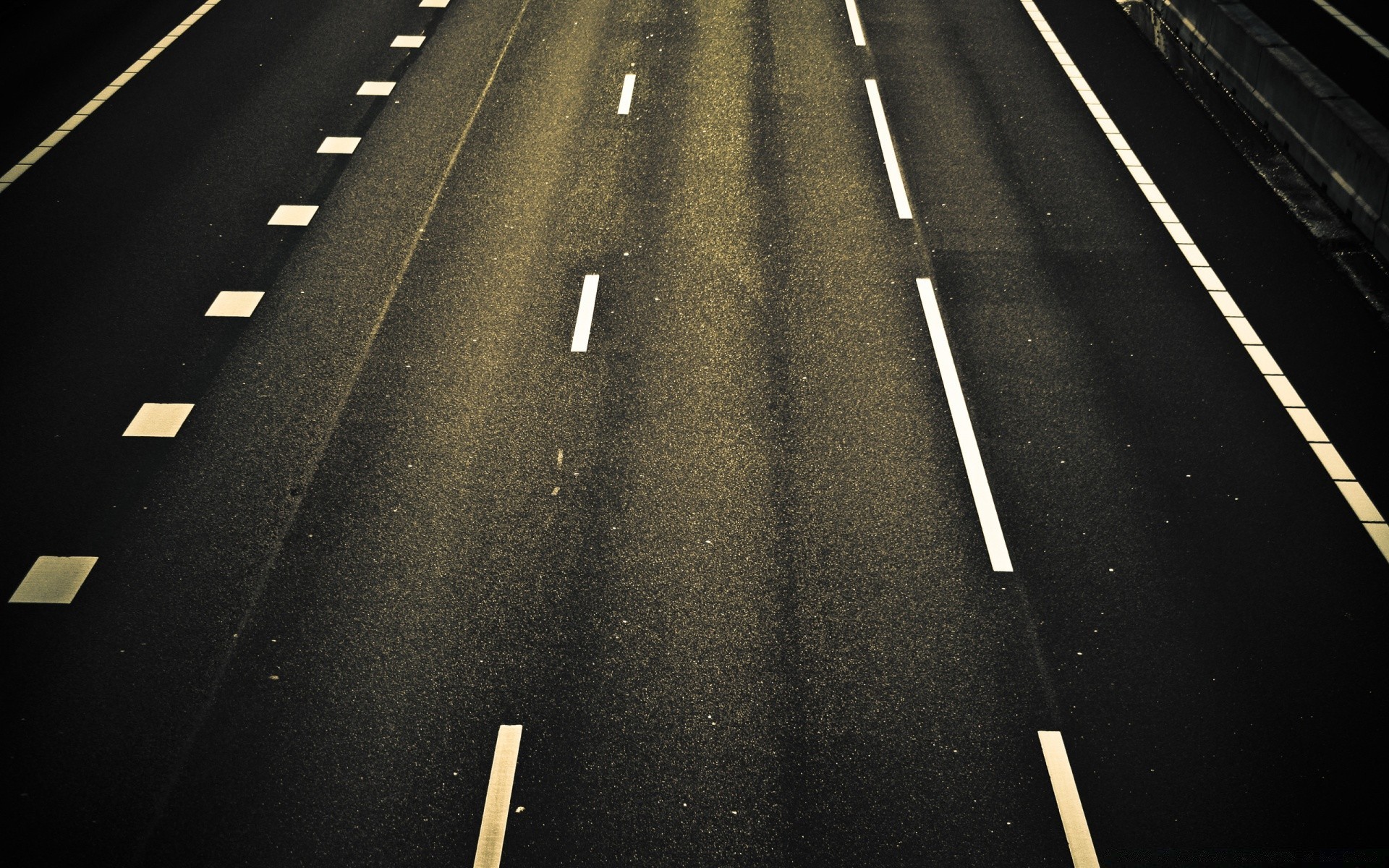 Eine düstere Asphaltstraße, die aus der Dunkelheit herauskommt