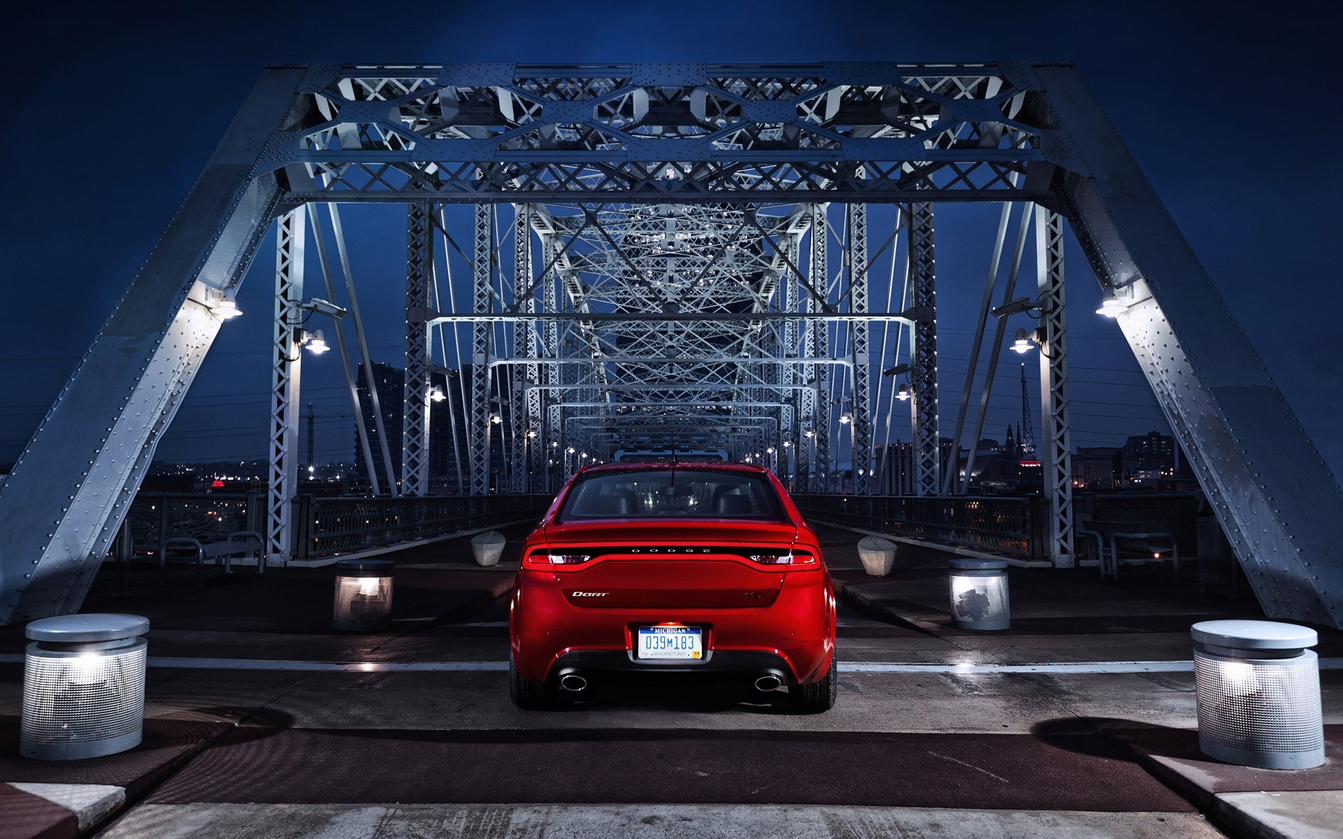 Rotes Auto auf der Nachtbrücke