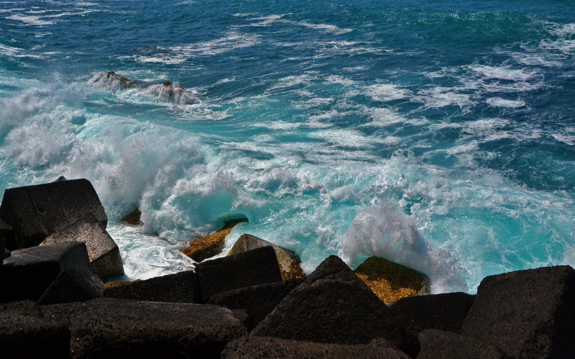 Meereswellen mit Schaum brechen an Küstenfelsen zusammen