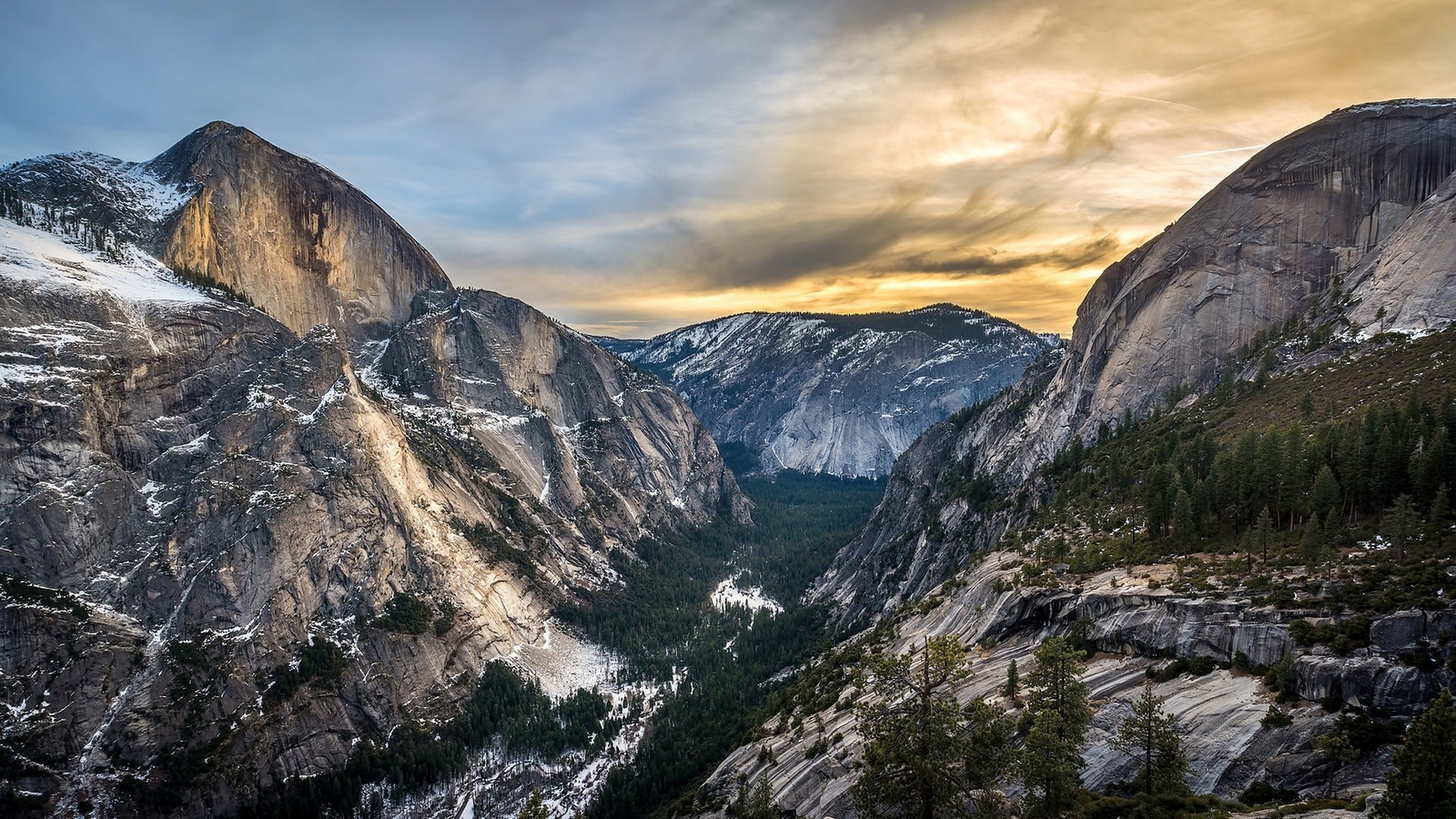 Spektakulärer Sonnenuntergang vor dem Hintergrund der schneebedeckten Berge
