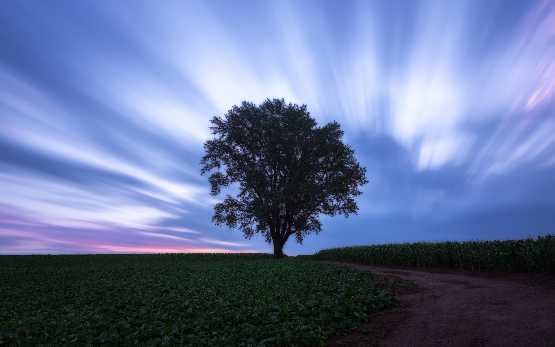 Ein einsamer Baum auf dem Feld, als ob die Sonne umhüllt