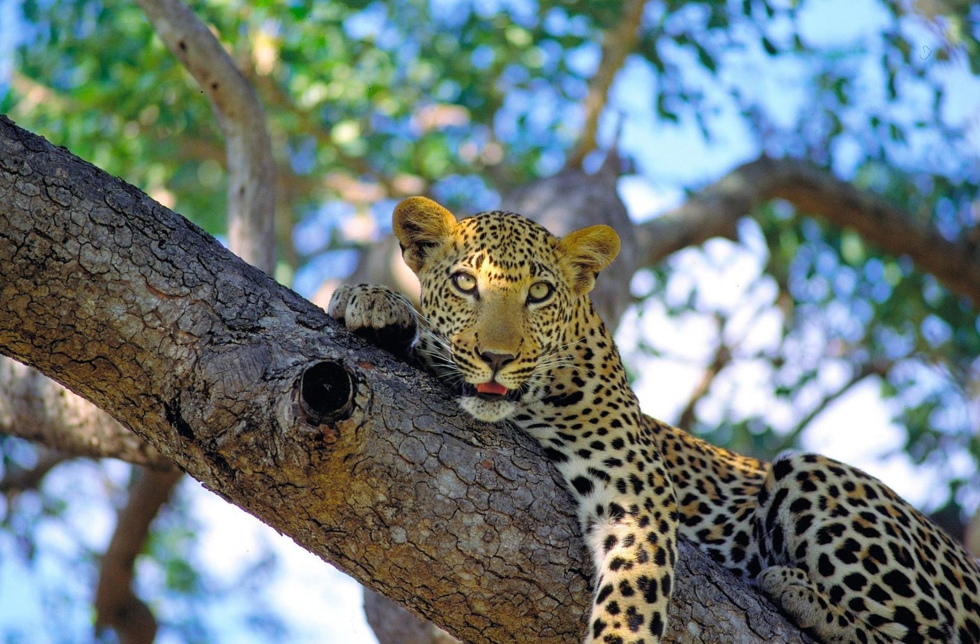 Ein Leopard liegt und ruht auf einem Baum