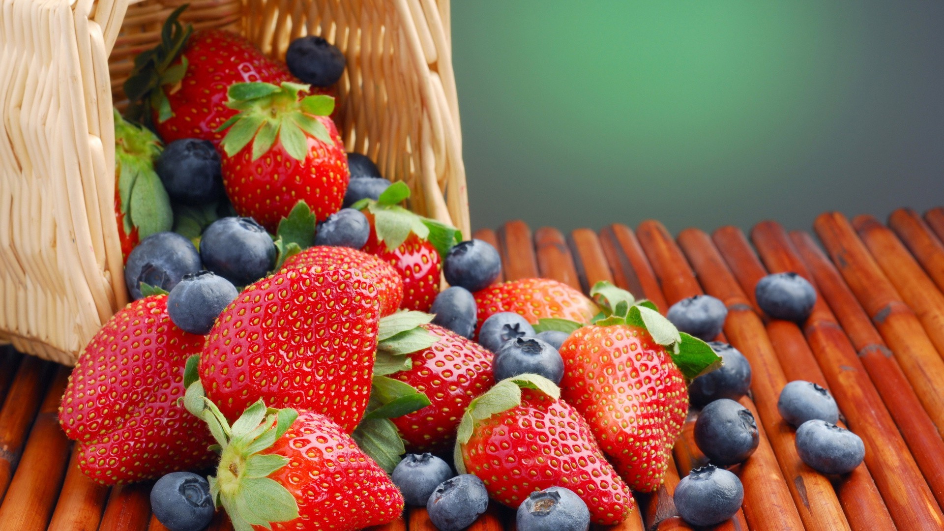 Erdbeeren und Blaubeeren wurden aus dem Korb geschüttet