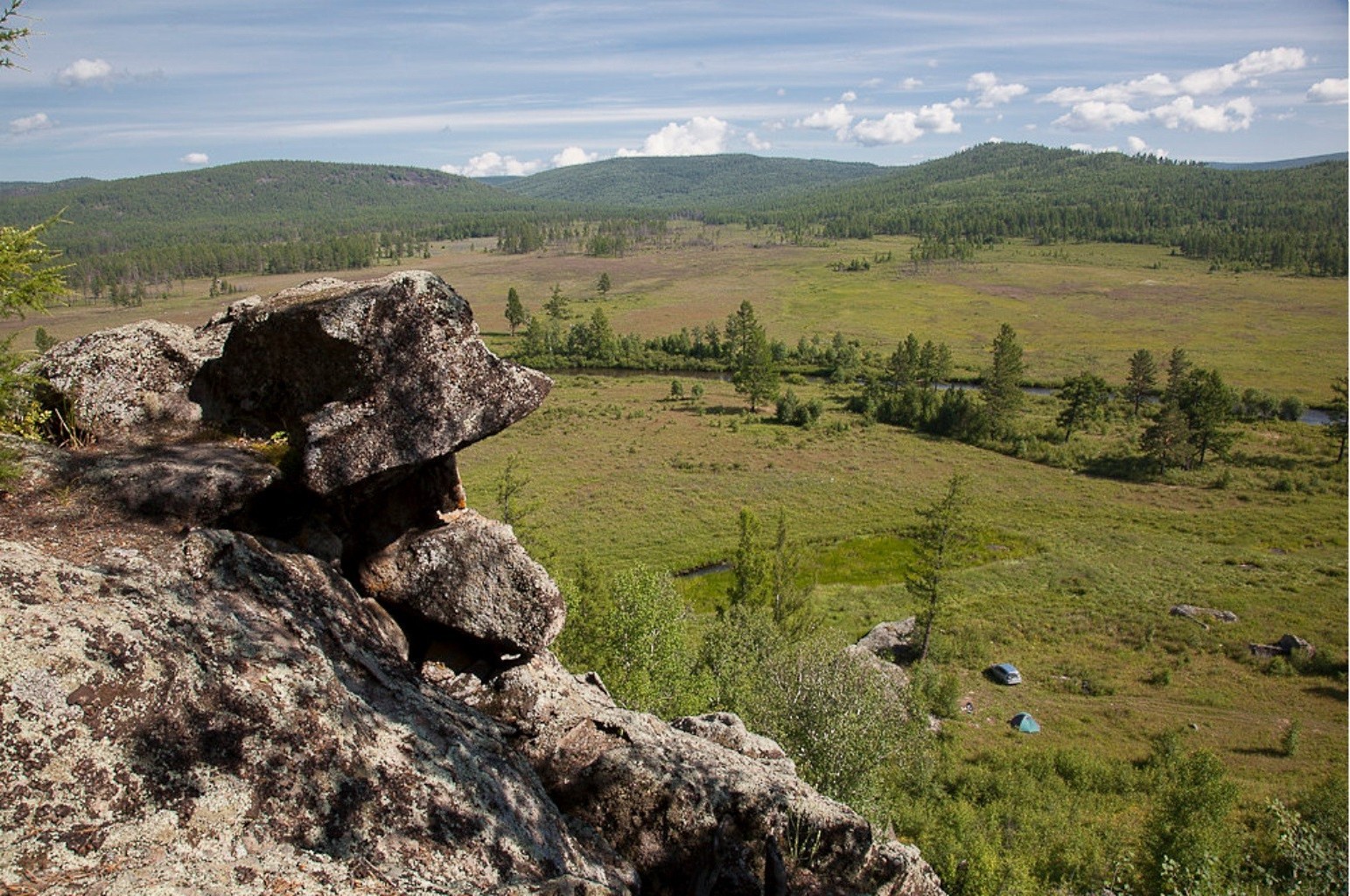 Sonnenuntergang vor dem Hintergrund der Berge von Wasser und Wald