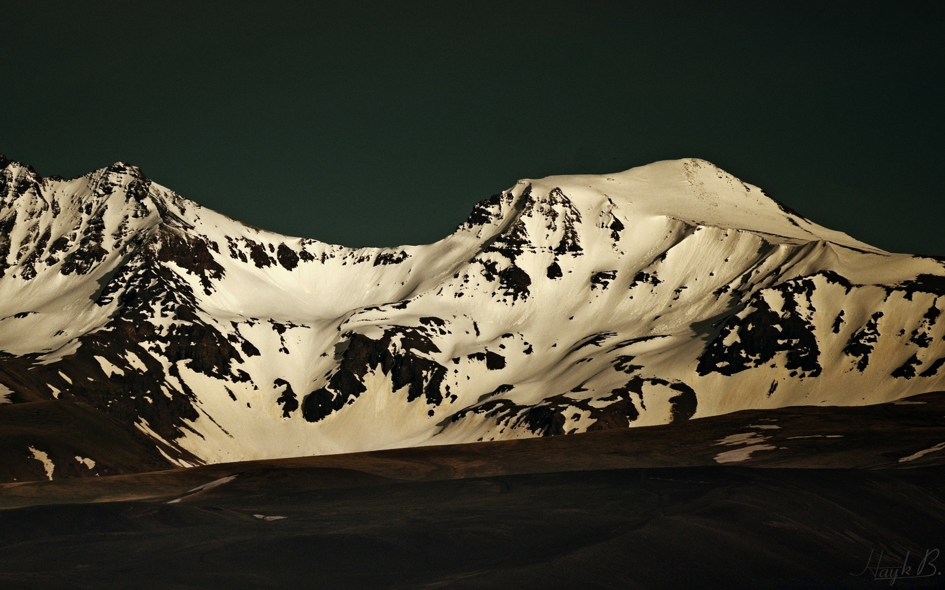 Schneebedeckte Berge auf Sonnenuntergang Hintergrund