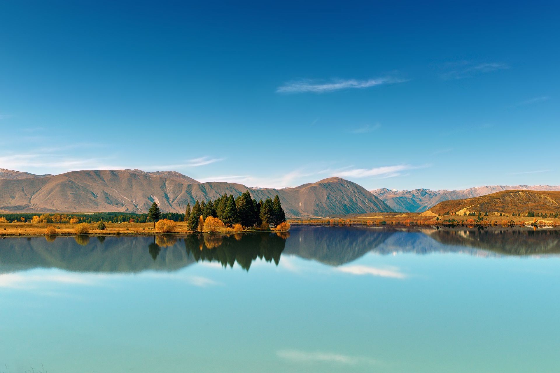 Herbstliche Landschaft. Bergsee, Berge, blauer Himmel