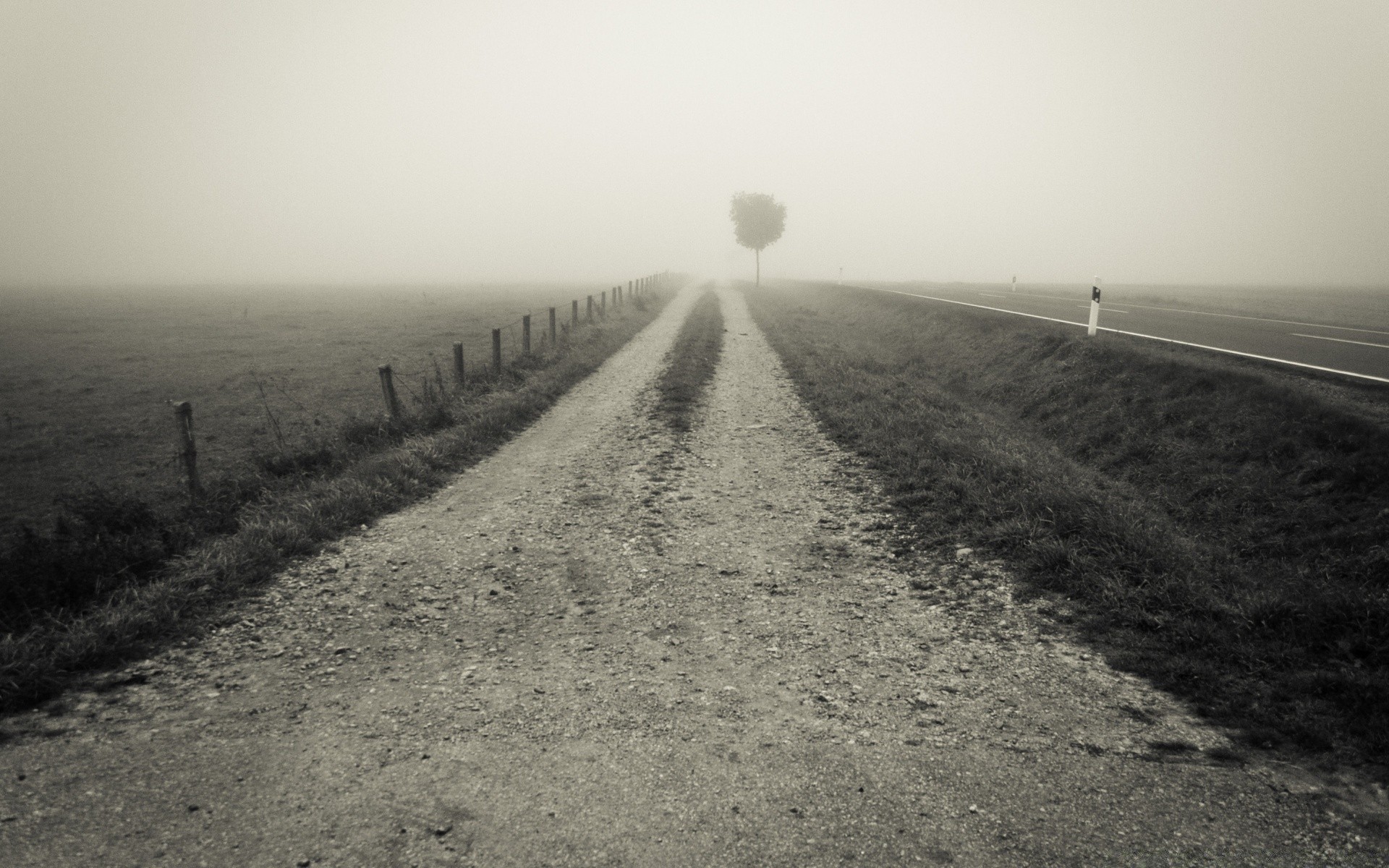 Eine neblige Straße. Jahrgang. Sonnenaufgang