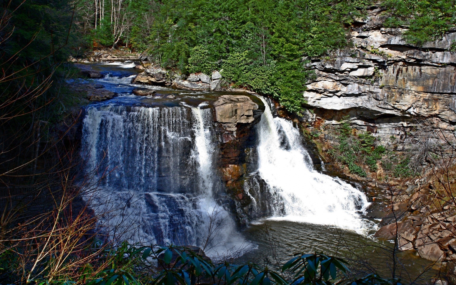 Schöne Wasserfälle steigen auf die Felsen ab