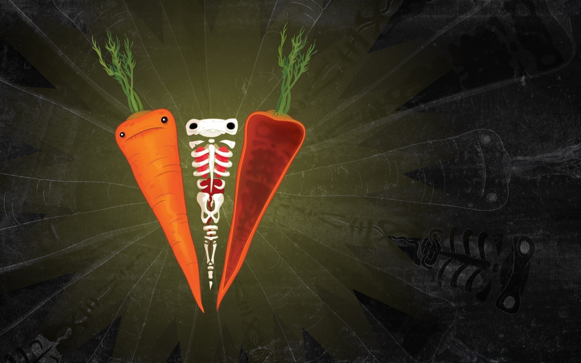 Karotten mit Augen, halbiert und in ihr Skelett geschnitten