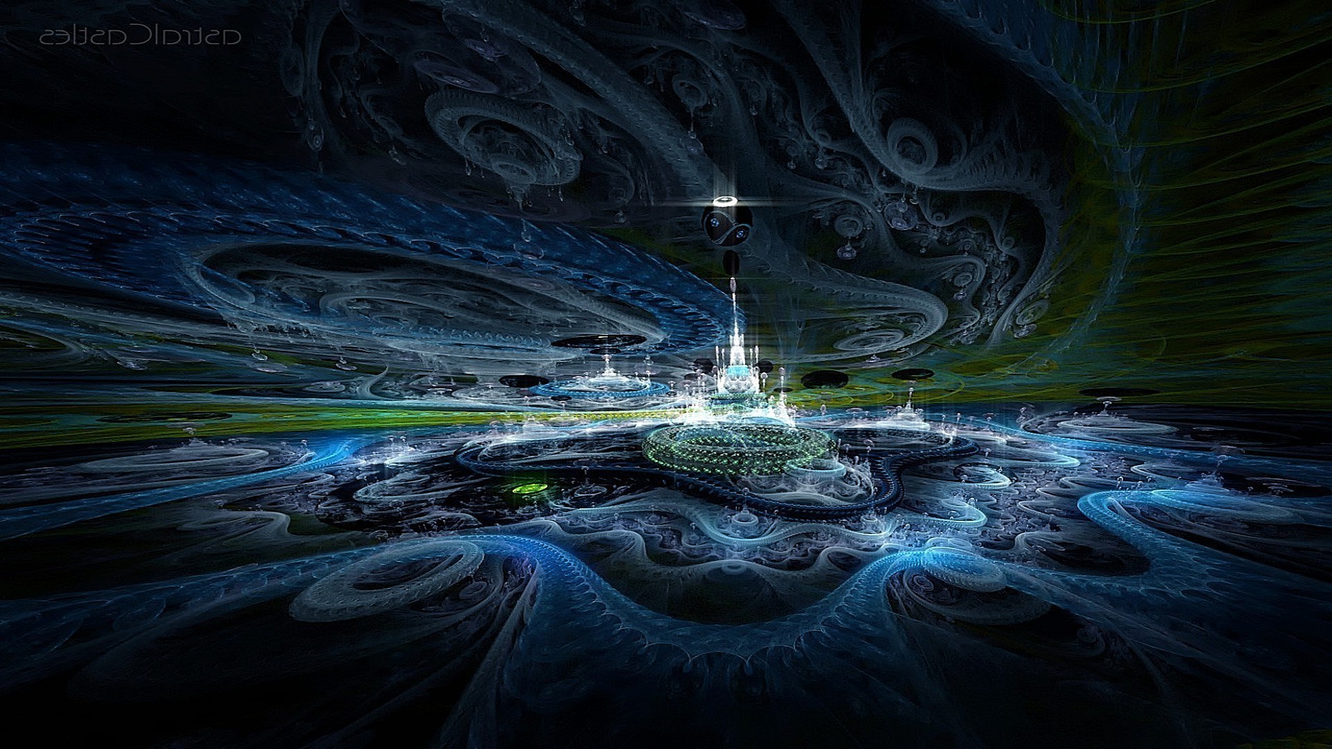 Eine märchenhafte stadt. blaue muster auf dunklem hintergrundEine märchenhafte Stadt. Blaue Muster auf dunklem Hintergrund