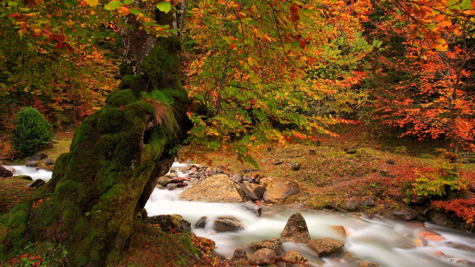 Der Wasserfall mündet vor dem Hintergrund der Herbstbäume in den Fluss