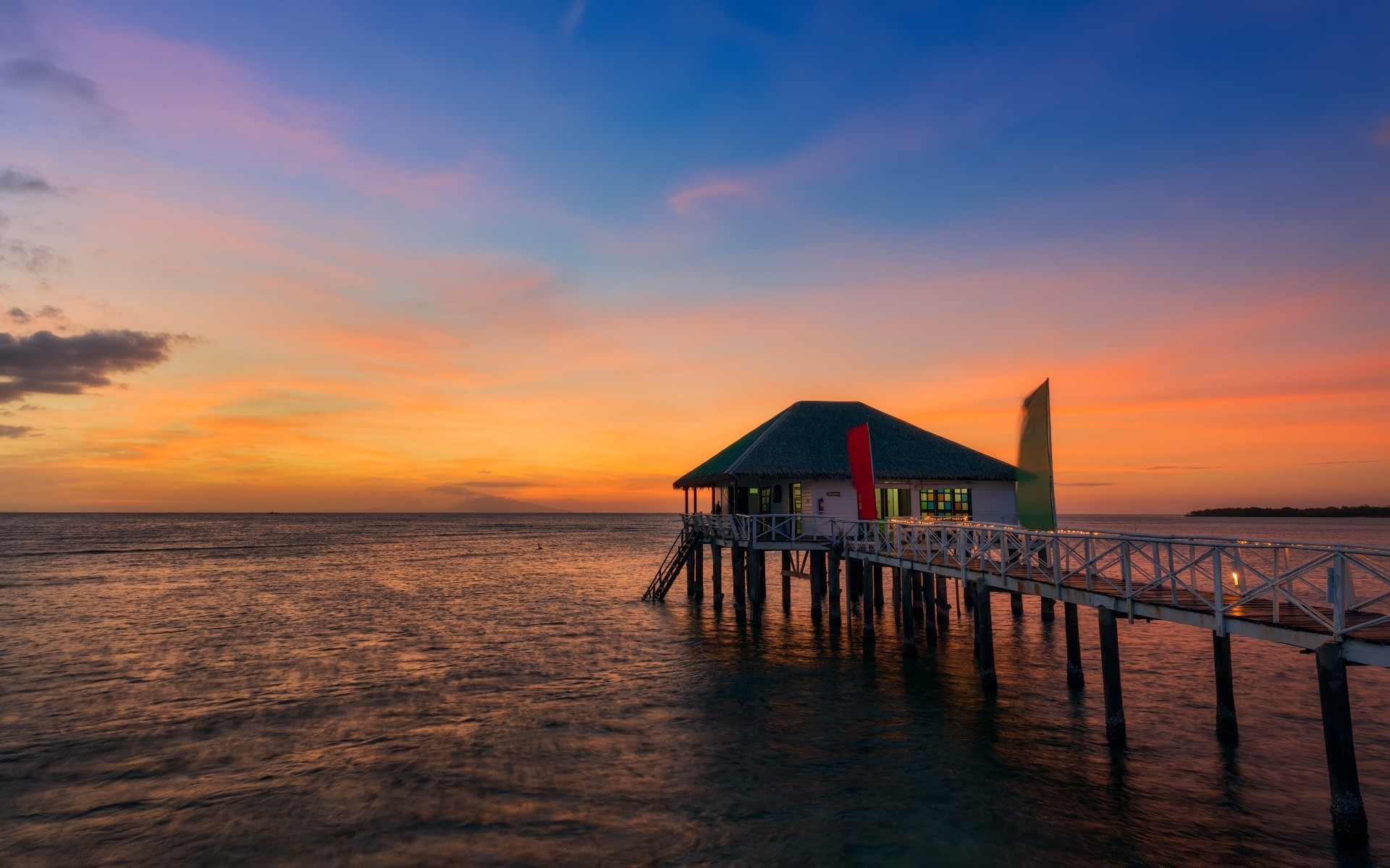 Schöner blick auf den sonnenuntergang. haus über dem meerwasserSchöner Blick auf den Sonnenuntergang. Haus über dem Meerwasser
